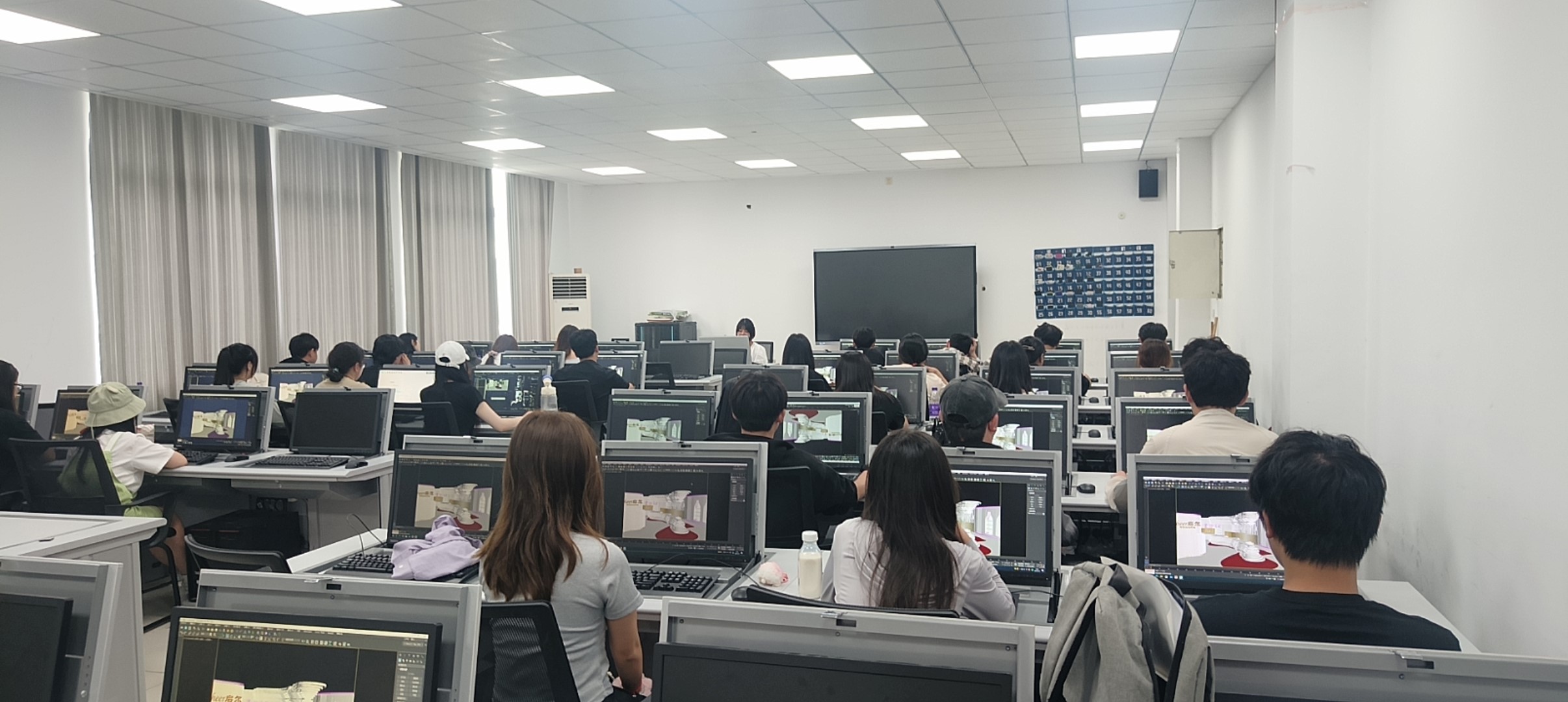 开放实验实训室活动。5月24日,建筑装饰教研室朱丽娟老师以“红酒专卖店展示空间设计”为主题开展实训机房教学示范课。朱丽娟老师在实训机房中,结合红酒空间的流线设计造型,运用 CAD绘制地面倾泻的红酒造型,流线型酒具台,重点运用3DMAX中绘制流线地面造型和曲线展台,同时在3DMAX软件中给出Vray材质,设置室外天光,室内筒灯,展示文化墙暗藏灯等,最终进行红酒专卖店展示空间的大图渲染,充分提高了学生的软件实操能力,为以后室内设计实习及工作就业打下坚实基础,提高了实际运用能力。