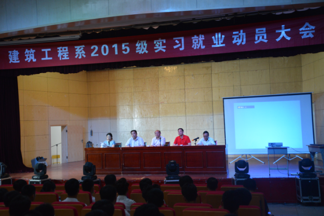 2017年6月1日下午,建筑工程系在大学生活动中心举行2015级学生实习就业动员大会,学院副院长周晓隆教授、教务处处长宋风长副教授莅临大会,建筑工程系主任范家茂副教授、建筑工程系党总支书记李红雨同志出席,大会由建筑工程系副主任魏永恒副教授主持,部分专业课教师、辅导员及2015级全体学生参加。