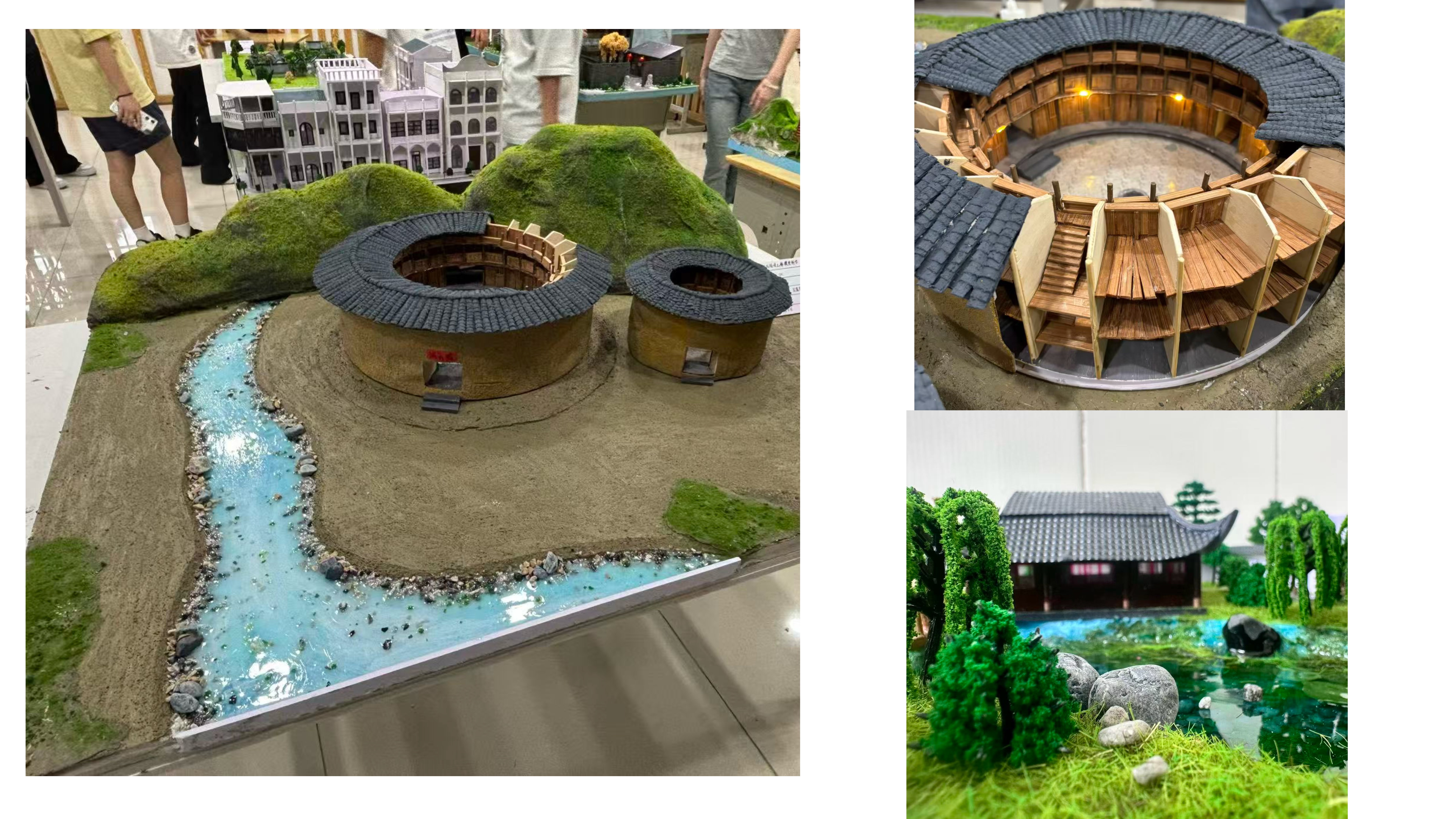 《模型制作》展区,仿佛开启了一场跨越地域与时空的中国传统建筑巡礼。在刘夏老师的指导下,同学们将徽派建筑标志性的粉墙黛瓦、错落有致的马头墙在雪弗板的精细切割与颜料晕染下跃然眼前;晋派(或陕派)的厚重窑洞与宏伟大院,通过纸吸管巧妙组合模拟的梁架结构,展现出黄土高原的雄浑气魄;京派民居四合院的浑厚庄严,体现在精雕细琢的屋顶脊兽与严谨对称的布局模型之中;苏派园林的“咫尺之内再造乾坤”,则在微型假山、曲廊、水景的巧妙布置中传递出江南的婉约诗意。此外,闽派(如土楼)、川派(如吊脚楼)、岭南派以及海派等极具地域特色的建筑流派模型也各放异彩。