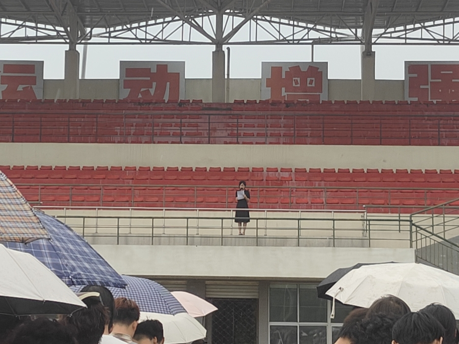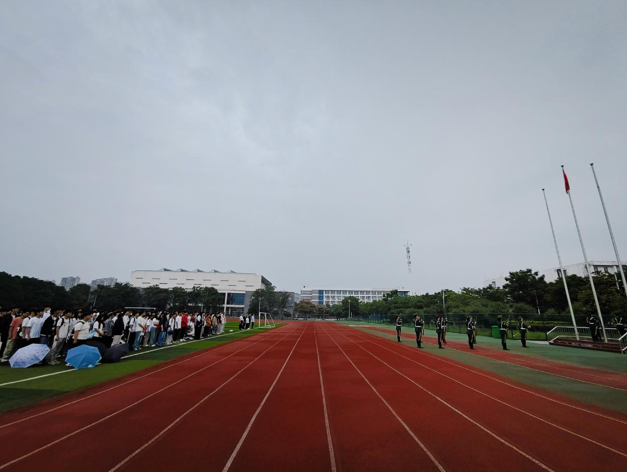 8点整,升旗仪式正式开始。国旗护卫队的队员们迈着整齐而坚定的步伐,护送着鲜艳的五星红旗走向升旗台。在全体师生庄严肃穆的注视下,国歌奏响,五星红旗在雨中缓缓升起,迎风舒展,仿佛在诉说着对祖国的忠诚与热爱。