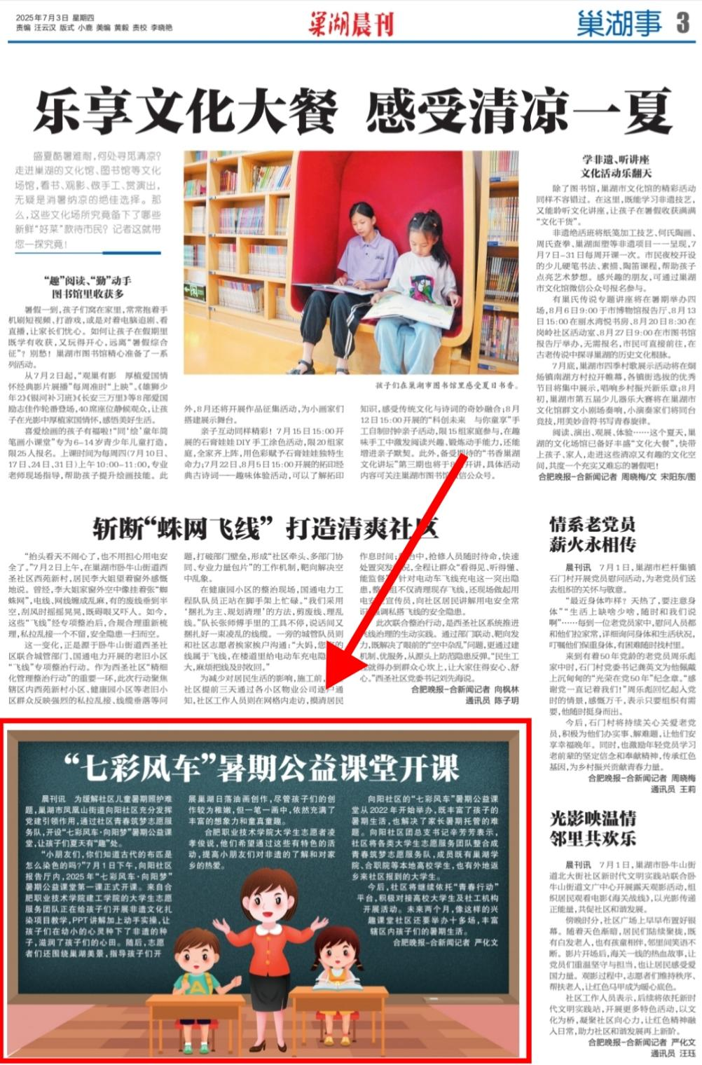 6月30日至7月6日,开云kaiyun体育开云kaiyun体育“微光成炬 一路向阳”实践团走进巢湖市凤凰山街道向阳社区,开展为期一周的“七彩风车・向阳梦”暑期公益课堂活动。7名实践团成员带着精心设计的课程方案,为社区儿童带来了一段充实而有趣的学习时光。