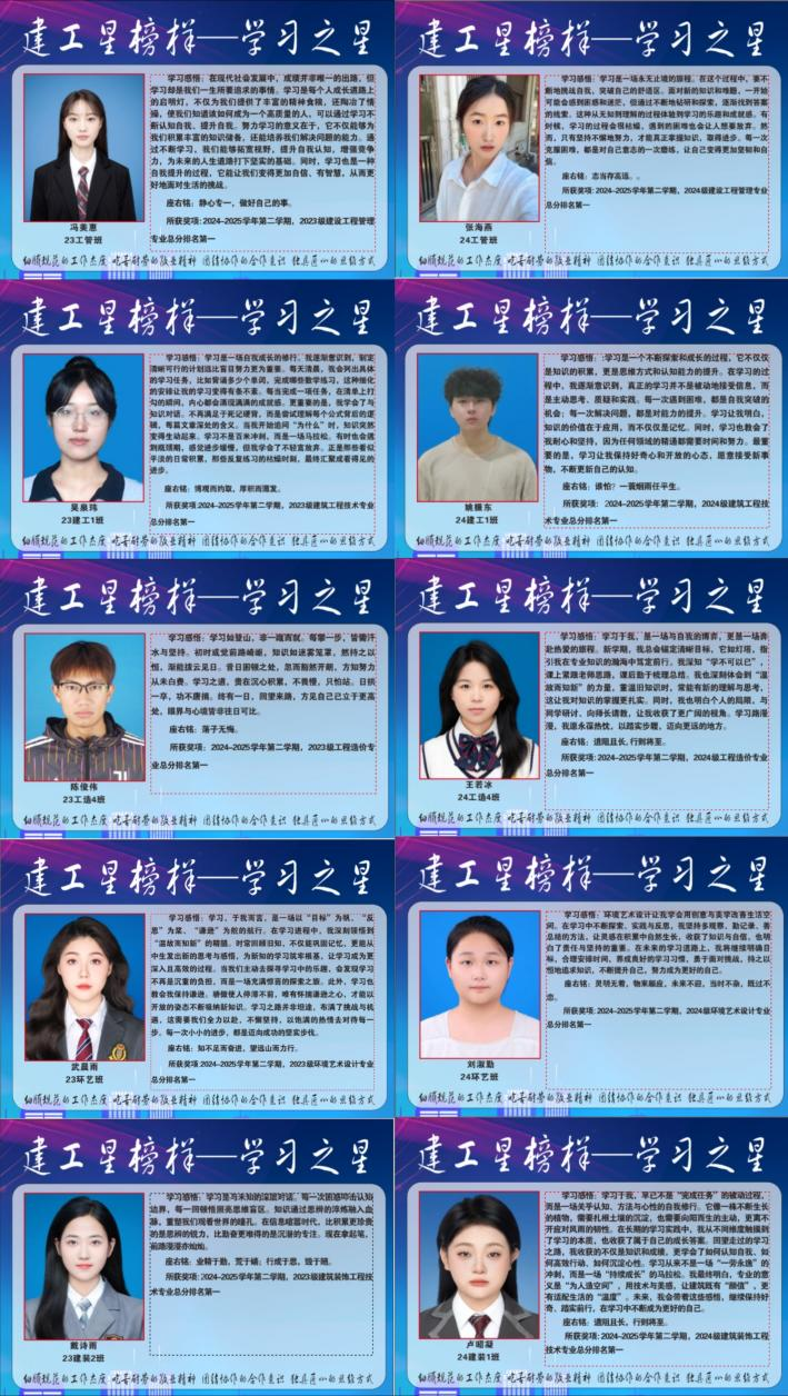 开展“建工星榜样之‘学习之星’”评选活动,旨在通过树立优秀学生榜样,发挥先进典型的示范引领作用,激励更多同学勤奋学习、追求卓越。未来,学院将继续深化“三全育人”工作理念,进一步完善先进典型选树机制,通过“弘徽讲堂”“奖学金获得者分享会”等品牌活动,举办学习经验分享会、优秀学子座谈会等,推动形成良好学风,营造更加浓厚的学习氛围,助力学生全面成长成才。(供稿:昌逸文 初审:施芳芳 审核:丁怡琴)