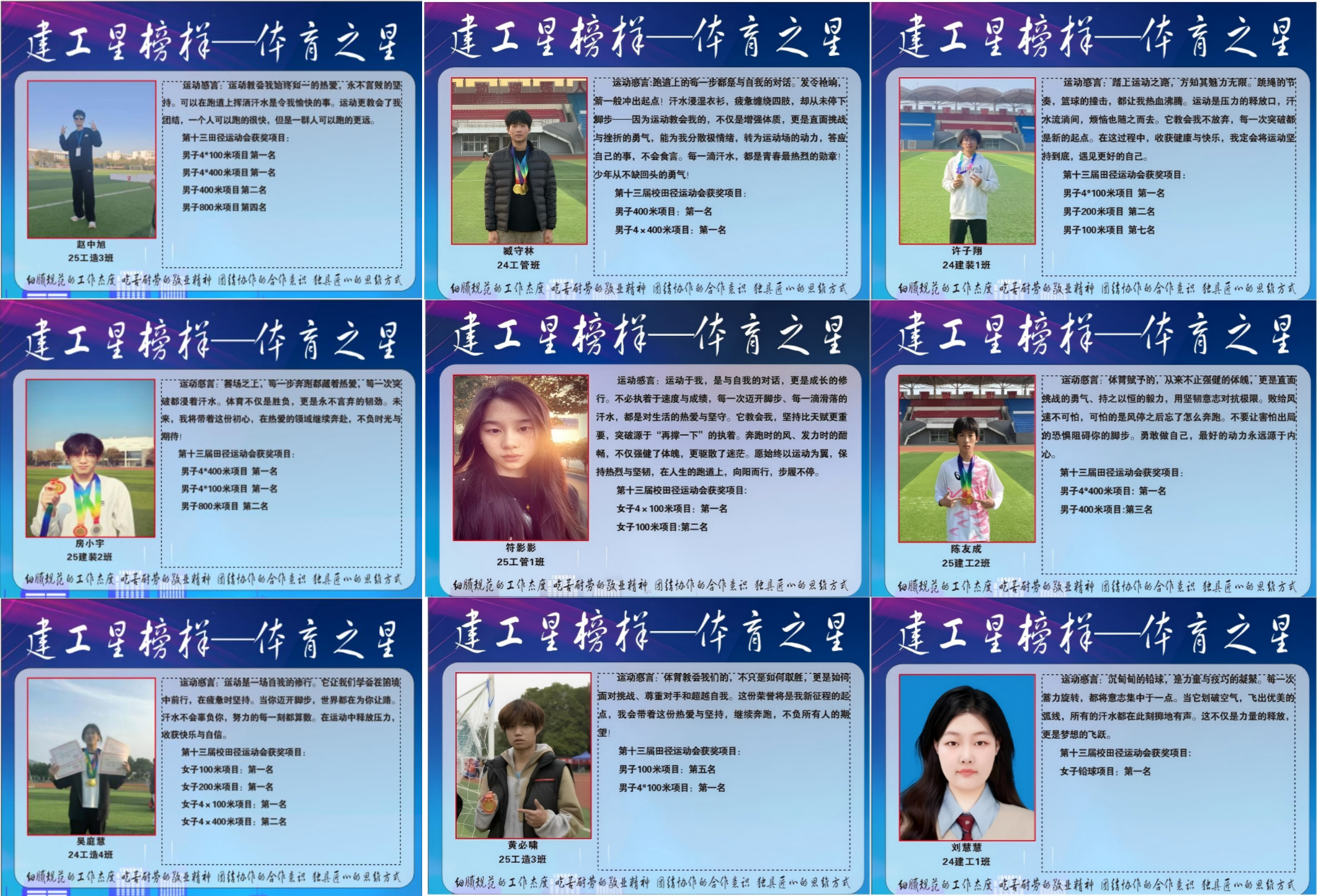 为进一步发挥先进典型的示范引领作用,激发广大学生参与体育锻炼的热情,营造“比学赶超、奋勇争先”的校园氛围,近日,开云kaiyun体育成功举办“建工星榜样——体育之星”评选活动。本次活动主要依据开云第十三届田径运动会中开云kaiyun体育运动健儿们的竞技表现与得分情况,经过综合评议,最终评选出9名成绩突出的运动员,授予“体育之星”荣誉称号。他们分别是:25工造3班赵中旭、25建装2班房小宇、24工造4班吴庭慧等同学。他们在赛场上挥洒汗水、顽强拼搏,不仅为学院赢得了荣誉,更充分展现了建工学子昂扬向上、奋发有为的精神风貌。