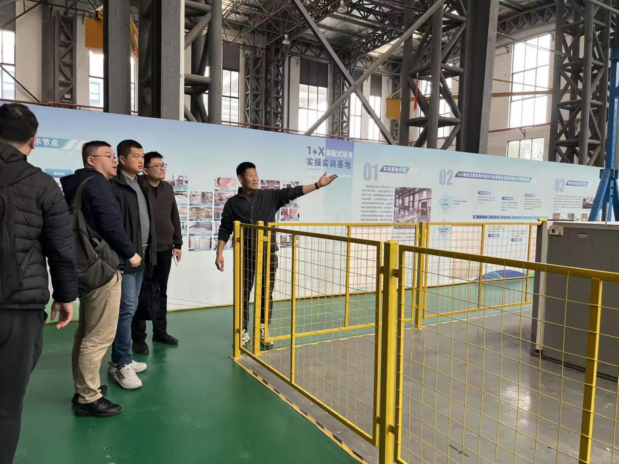 交流中,双方重点围绕建设工程管理本科专业人才培养体系展开深入探讨。王春福分享了其新开设的智能建造工程本科专业人才培养方案,从课程设置、实践环节、师资配置等方面进行详细解读。在产教融合领域,该校与建科院合作打造的既有建筑体检中心令人瞩目,其聚焦智能检测与加固修复的核心业务,实现了教学与行业需求的精准对接;而与当地家具企业联合研发的一体化绿色装配式建筑项目,则展现了校企协同创新的鲜明特色。考察组还实地参观了该校智慧工地实训课堂,其依托中央财政支持实训基地构建的沉浸式实训场景给考察组留下深刻印象。
