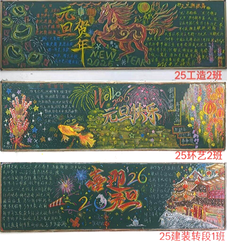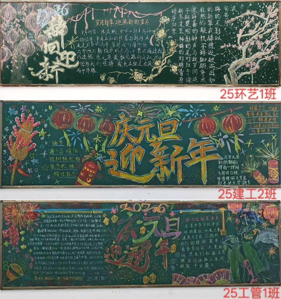 活动启动后,各班级高度重视,迅速组建创作小组,围绕“庆元旦 迎新年”主题精心构思版面设计、内容编排与色彩搭配。同学们充分结合建筑工程专业特色,将新年元素与专业知识巧妙融合,有的以简约大气的线条勾勒建筑轮廓,搭配新年灯笼等元素,彰显建工学子的审美素养;有的以文字排版为重点,书写元旦由来、新年寄语与青春誓言,传递对新年的美好期盼;还有的融入手绘插画、创意字体等元素,让黑板报既富文化内涵,又具视觉冲击力。绘制过程中,同学们分工协作、默契配合,擦黑板、打草稿、勾线条、填色彩,每一个环节都精益求精,用耐心与细心将普通的黑板打造成一幅幅精美的文化作品,充分展现了班级的集体智慧与协作精神。