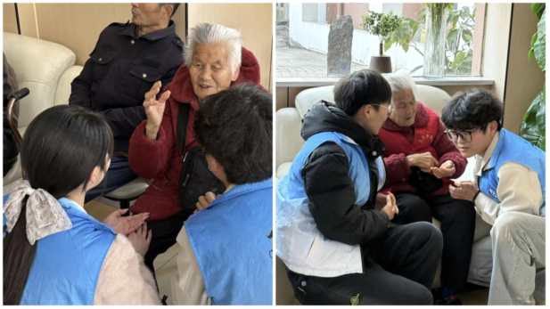 活动现场,温情暖意无处不在。志愿者们主动围坐在老人们身边,化身最专注的倾听者,陪老人们唠家常、忆往昔、谈近况。面对听力较弱的老人,志愿者们便俯身贴近耳边,放慢语速、耐心重复;听到老人们讲述过去的岁月故事,大家认真回应、适时互动,偶尔分享自己的校园生活与青春趣事,一老一少的亲切交谈,让护理院充满了欢声笑语。