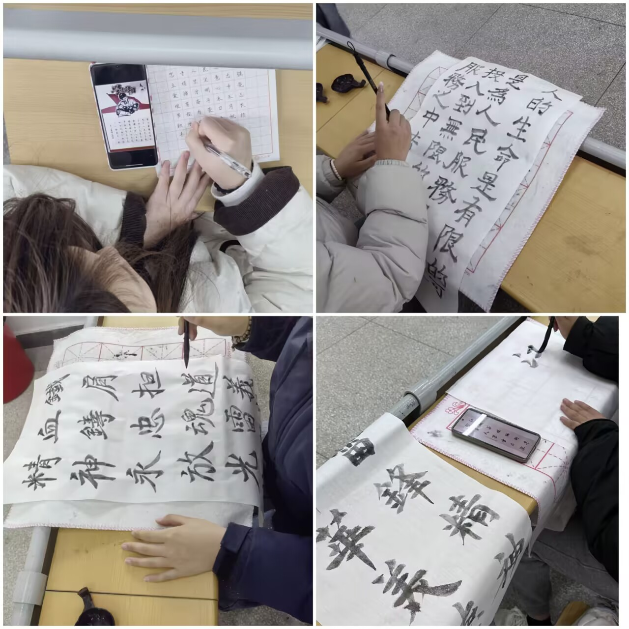 活动现场,墨香四溢、氛围浓厚。社员们铺纸研墨、执笔凝神,以饱满的热情投入到书写中。软笔组的社员们挥毫泼墨,笔墨苍劲有力、气韵生动,“人的生命是有限的,可是,为人民服务是无限的”“我愿永远做一颗永不生锈的螺丝钉”等经典雷锋语录跃然纸上,笔锋流转间饱含对榜样的敬仰;硬笔组的社员们字迹工整清秀、端庄规范,一笔一画认真誊写,将对雷锋精神的理解与感悟融入每一个笔画之中,于细微处传递着对美德的追求。有的社员相互交流书写心得,在切磋中提升技艺,在交流中深化对雷锋精神的理解,社员们在书写过程中,重温雷锋同志的赤子情怀,深刻领会雷锋精神的丰富内涵与时代意义。