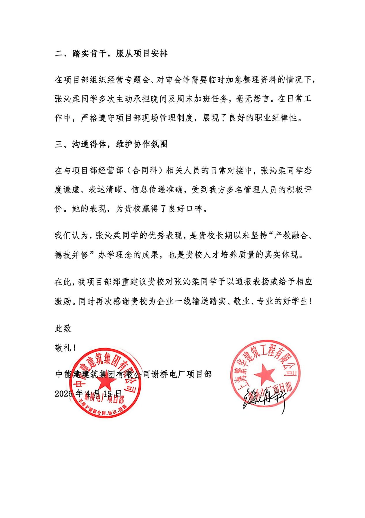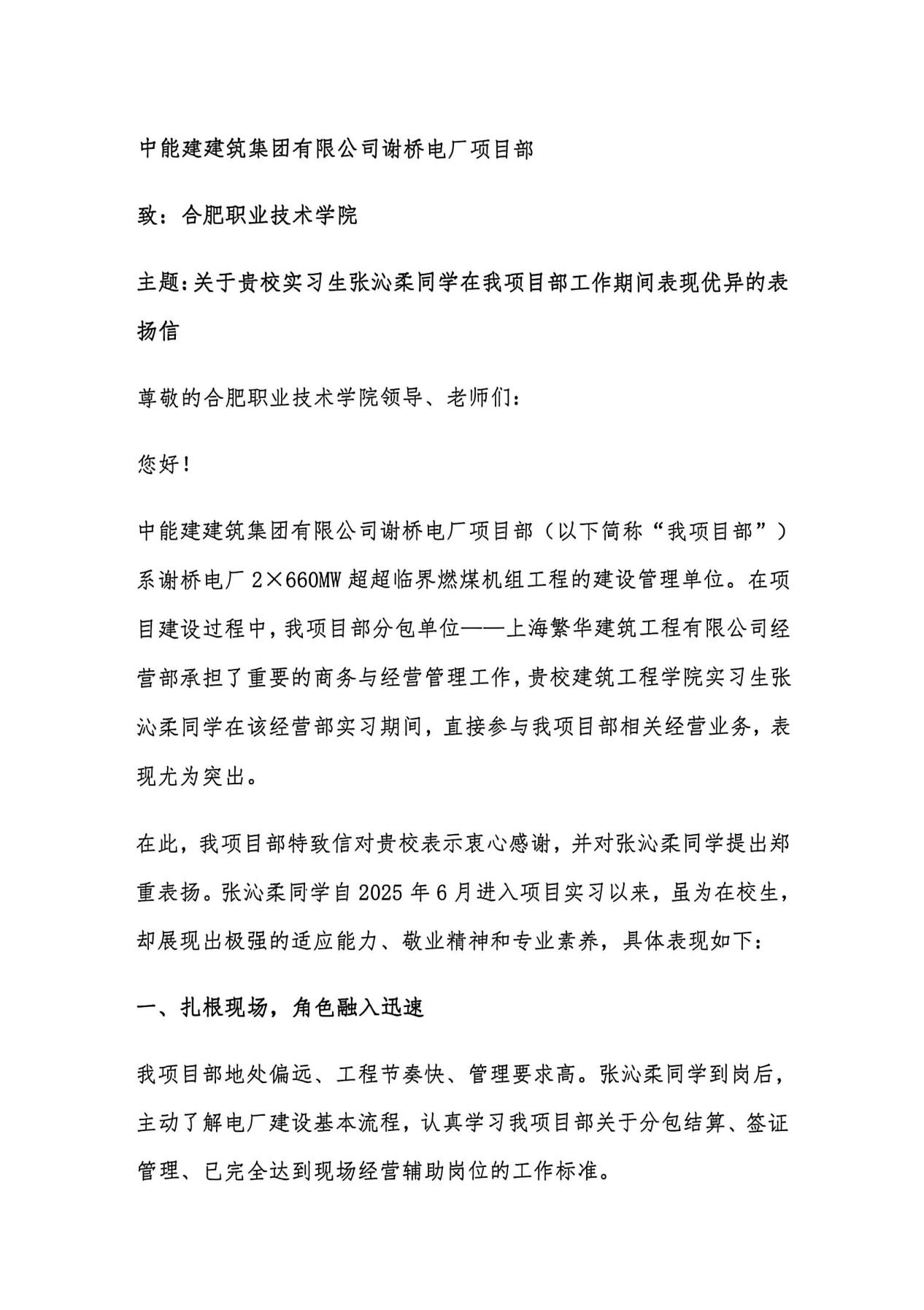 近日,中能建建筑集团有限公司谢桥电厂项目部向开云发来表扬信,对开云kaiyun体育23级工程造价2班学生张沁柔实习期间的优异表现给予高度评价,同时肯定了学校“产教融合、德技并修”的办学理念与人才培养质量。