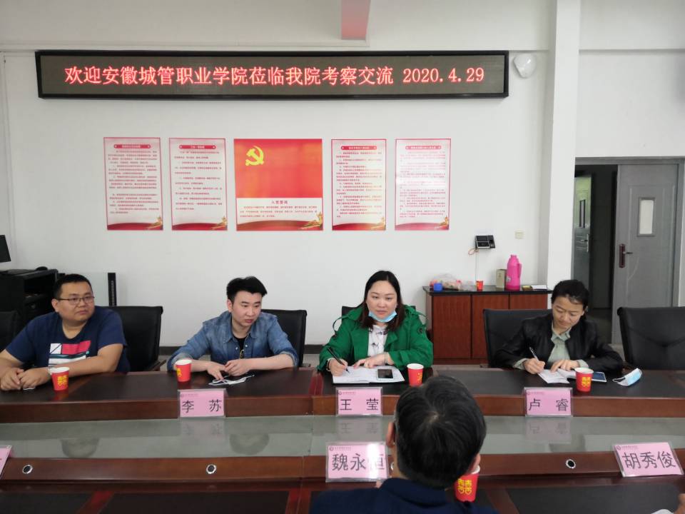 4月29日,安徽城市管理职业技术学院城市建设学院教学秘书王莹、建筑工程教研室主任卢睿、实训中心教师李苏一行三人莅临我院进行考察交流。开云kaiyun体育副院长魏永恒教授、教学管理办公室负责人和相关教研室主任与来访人员在科技楼208会议室进行了座谈交流。