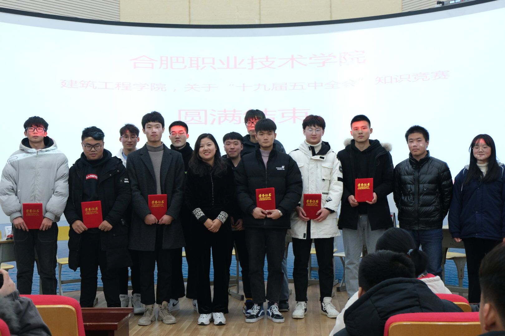 本次知识竞赛在深入学习领会十九届五中全会全会公报原文基础上,采用现场实时答题形式,以十九届五中全会要点为主要内容展开,竞赛题型分为单选、多选、填空等题型,共50道题。本次参赛选手按专业划分为6组,分别在各自小组初赛的基础上选拔出两名代表参加现场决赛。竞赛现场高潮迭起,精彩纷呈,各组选手激烈抢答,比分一度追平,最后通过加时赛决出前三名。来自20建装、环艺队的于晓东、彭乐获得第一名,20建工队的胡泊、巢志获得第二名,19级代表队的郭耀达、季必强获得第三名。赛后,学生党支部书记施芳芳对本次竞赛作了点评,充分肯定了选手们的精彩表现,各位选手赛前准备充分,现场比拼激烈,达到了以赛促学的目的。随后,她为获奖选手颁发荣誉证书并合影留念。