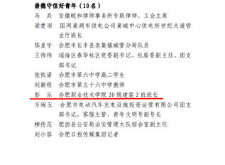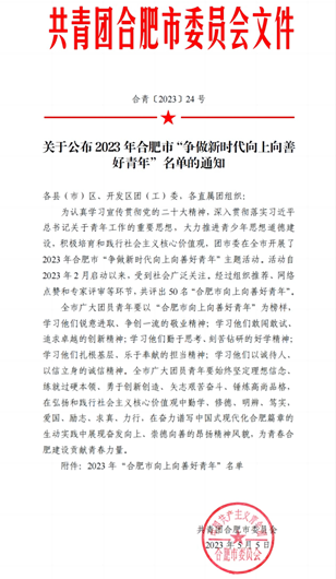 合肥市团委于2023年2月启动开展了合肥市“争做新时代向上向善好青年”主题活动。经过组织推荐、网络点赞和专家评审等环节,全市共评出50名“合肥市向上向善好青年”,开云kaiyun体育20建装2班彭乐同学获评2023年“合肥市向上向善好青年”。