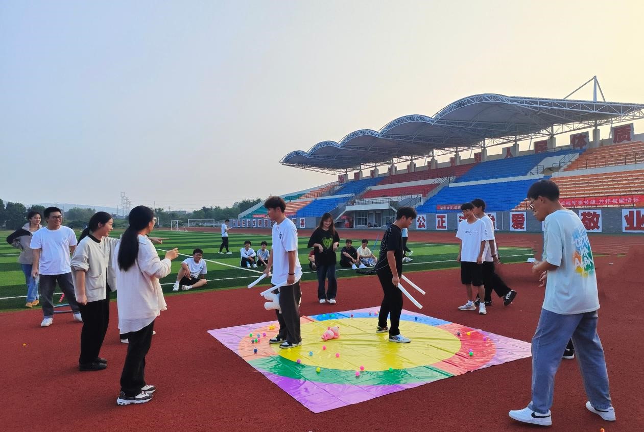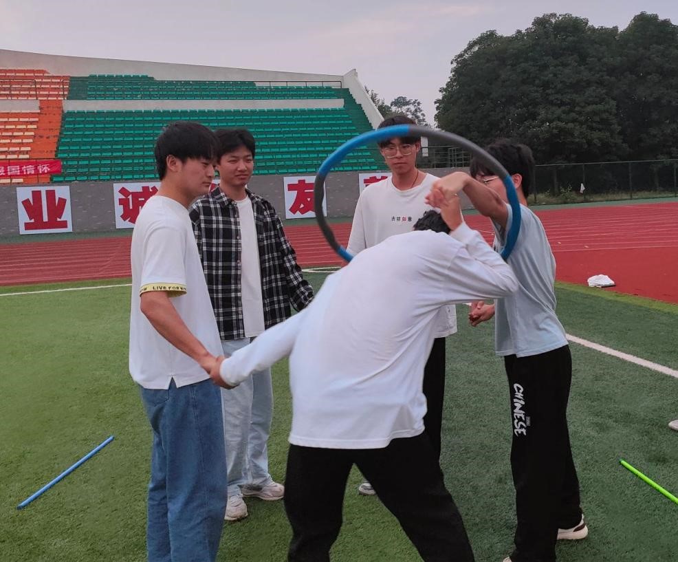 在风雨运动场上,同学们分成三组,轮流扮演“守护者”,守护圆圈中的玉兔,同学们配合得当,很快就拉近了关系,彼此熟悉了起来。
