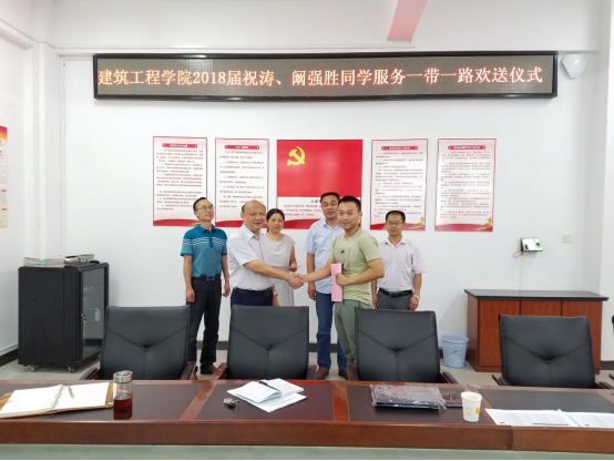 合肥建工集团结合实习期间表现并通过层层遴选,将我院2018届“合肥建工班”阚强胜、祝涛两名同学抽选赴合肥建工集团马来西亚碧桂园项目部工作。为此2018年7月5日上午,我院在综合实训楼会议室举行2018届阚强胜、祝涛两位同学赴合肥建工集团马来西亚项目欢送仪式,校党委委员副校长周晓隆出席欢送仪式,院班子成员及相关辅导员班主任参加。