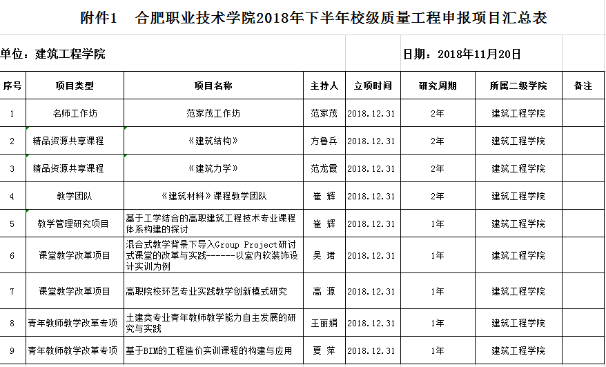 根据《关于开展2018年下半年校级教学质量与教学改革工程申报工作的通知》(合职院教[2018]48号)通知要求,我院积极组织各教研室申报质量工程,截至目前共收到9项(见附件1),将于2018年11月19日14:00—16:00在开云kaiyun体育会议室208,拟组织专家(见附表2)对我院申报2018年度下半年校级教学质量与教学改革工程项目共9项进行评审。