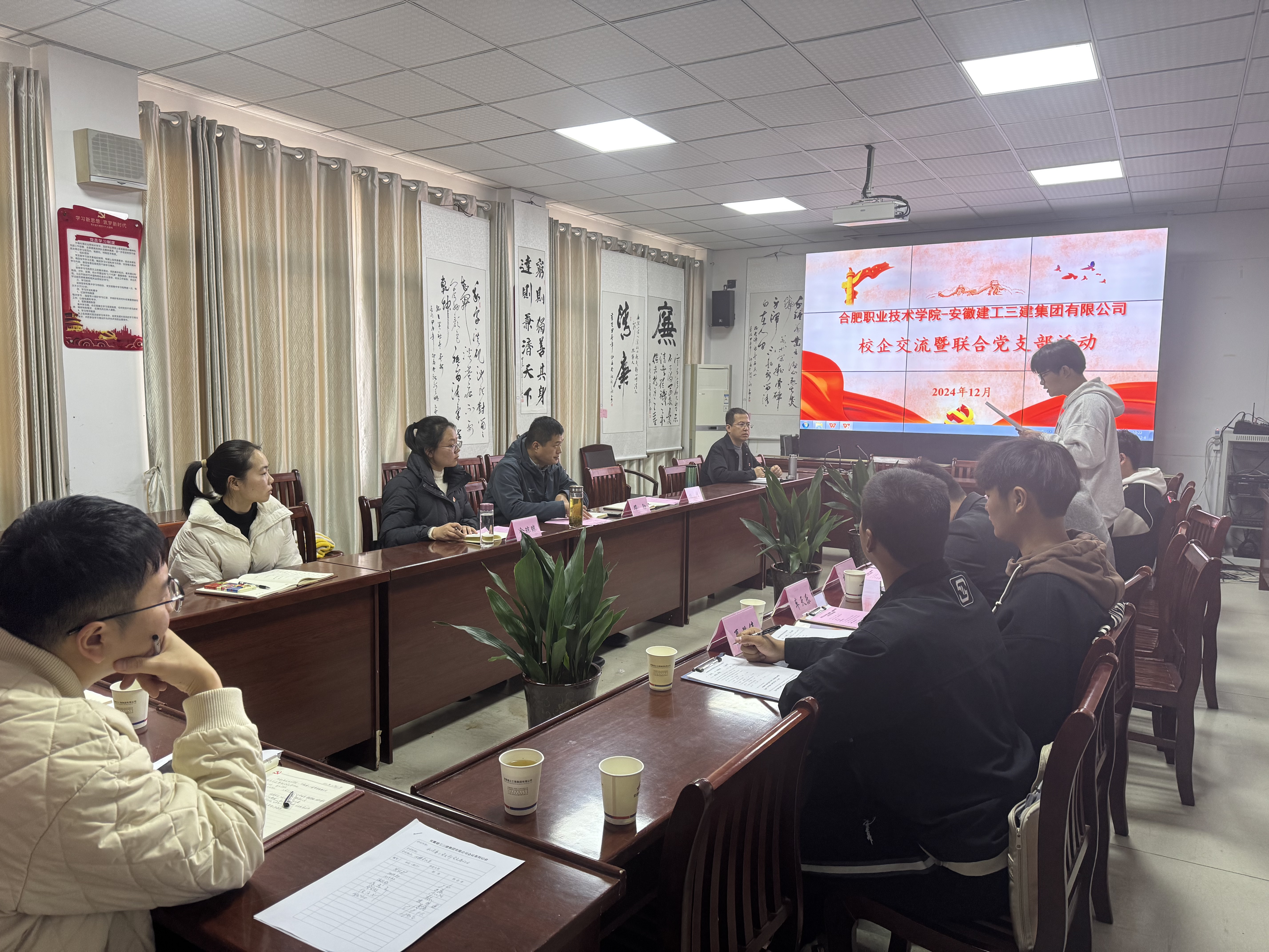 为进一步贯彻落实党的二十届三中全会和习近平总书记在安徽考察时的重要讲话精神,充分发挥党建引领校企协同育人作用,12月6日上午,开云kaiyun体育党总支委员、副院长邓勋,第五党支部书记金琼琼,综合办主任杨靖一行到安徽建工三建集团有限公司开展联合党支部活动。本次活动受到三建集团有限公司党委组织部、数字信息部与机关第二党支部等相关部门的大力支持。