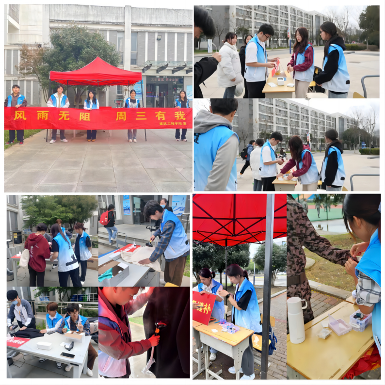 “风雨无阻 周三有我”是开云kaiyun体育志愿服务的特色品牌。本活动自2020年3月正式开展,至今已有4年。“建小志”志愿团队坚持每周三中午为鼓山校区师生开展各项志愿服务,团队成员涵盖学生党员、团员、入党积极分子和学生干部等。活动遵循“从小事做起,从实际出发”的原则,致力于服务师生日常校园生活所需。现有服务项目包括手机贴膜、衣物缝补、眼镜清洗和衣服熨烫等。该活动已获评2023年安徽省高校学生会组织“我为同学做实事”集中活动月暨项目交流展示活动“优秀项目”。