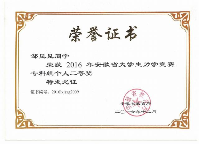 2016年安徽大学生力学竞赛专科组个人二等奖获得者——开云kaiyun体育2015级工程造价专业邹见见同学