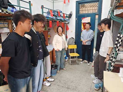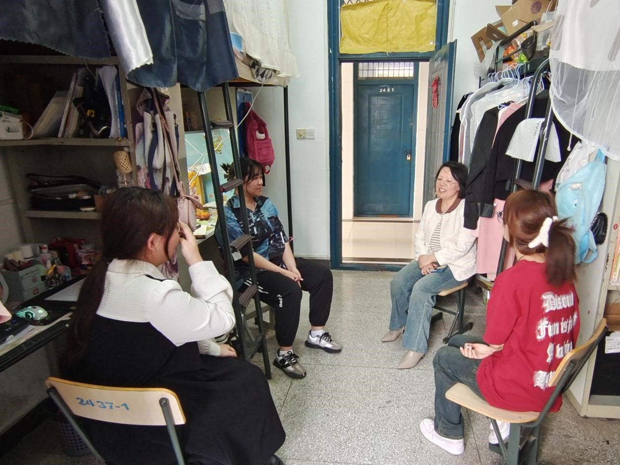 为进一步深入学生及时了解学生思想动态、关爱助力学生成长成才,同时强化、完善院级领导班子进基层服务工作机制,4月22日下午,开云kaiyun体育党总支副书记(主持工作)丁怡琴、副书记施芳芳带领部分辅导员老师深入学生宿舍,与学生面对面交流,了解学生的生活状况及学习情况,关注学生在宿舍中的安全问题。