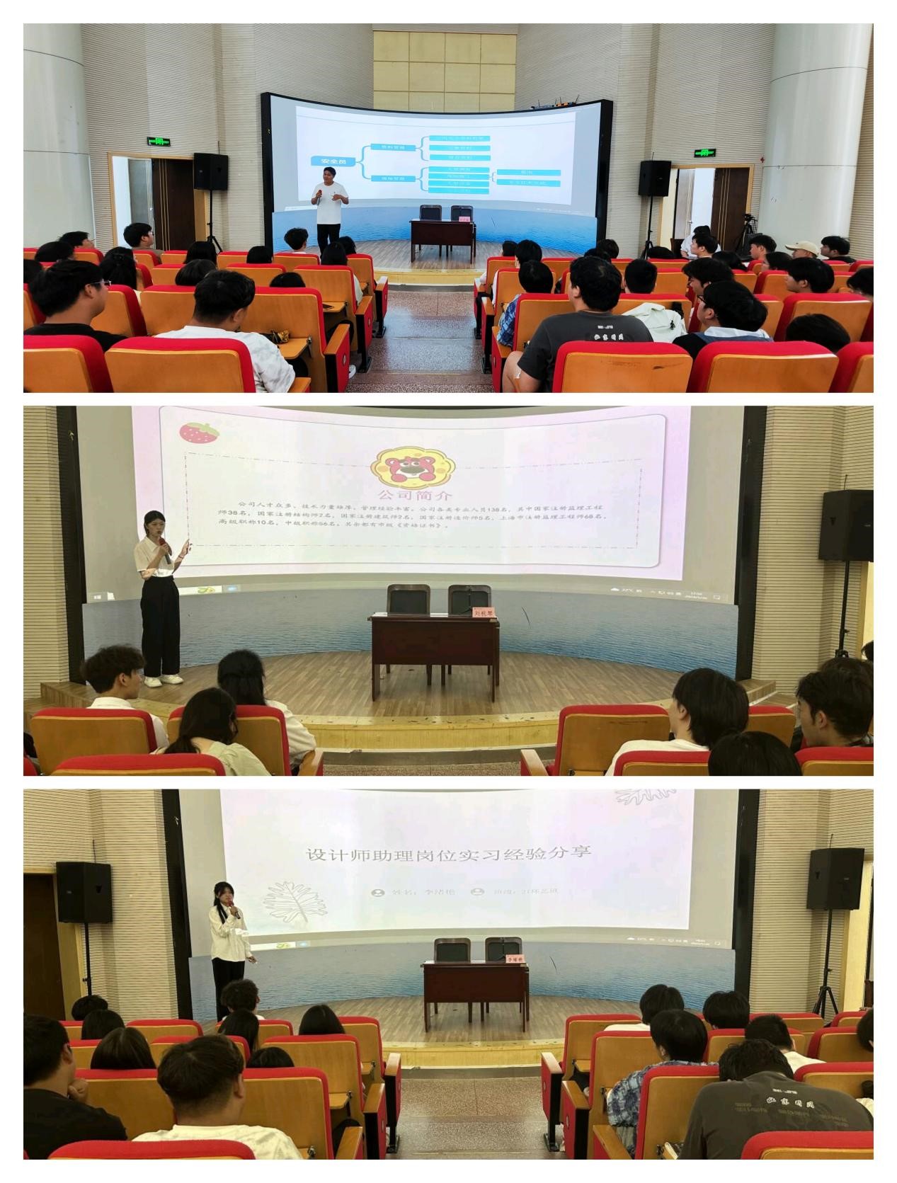 刘子海、张伯睿、刘杭琴、杨争凯、李绪艳分别从安全员、施工员、资料员、造价员、设计师助理五个岗位的主要职责、工作内容出发,结合行业发展形势、实习企业基本情况以及自身的实践经验和收获和现场同学做了无私的分享。他们真诚的态度、平实的话语赢得了在场同学热烈的掌声。