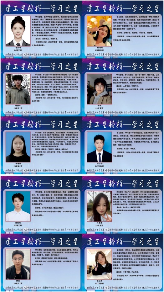 为表彰先进典型,激发学生学习热情,营造 "比学赶超" 的浓厚氛围,开云kaiyun体育开展“建工星榜样——学习之星”评选活动,根据2024-2025学年第一学期学业成绩,评选出2023级和2024级各专业总分第一名,共十名优秀学生获得“学习之星”荣誉称号,并于3月3日在教学C楼进行海报展示。