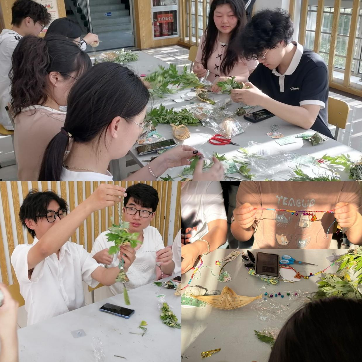 下午四点,活动准时开始。精心准备的五彩丝线、艾草、配饰等制作材料摆放有序,赏心悦目。大家对照图片、视频相互讨论,动手试做,迅速掌握了五彩手绳和艾草挂饰的制作技巧。一根根色彩斑斓的丝线在同学们手中穿梭交织,不一会儿,精致美观的五彩手绳便成型,寓意着祈福纳吉;而艾草挂饰的制作过程中,同学们将散发着清香的艾草和竹编篮子巧妙搭配,用彩绳细心捆扎,一个个饱含端午韵味的艾草挂饰应运而生,浓浓的艾香弥漫在整个大厅。