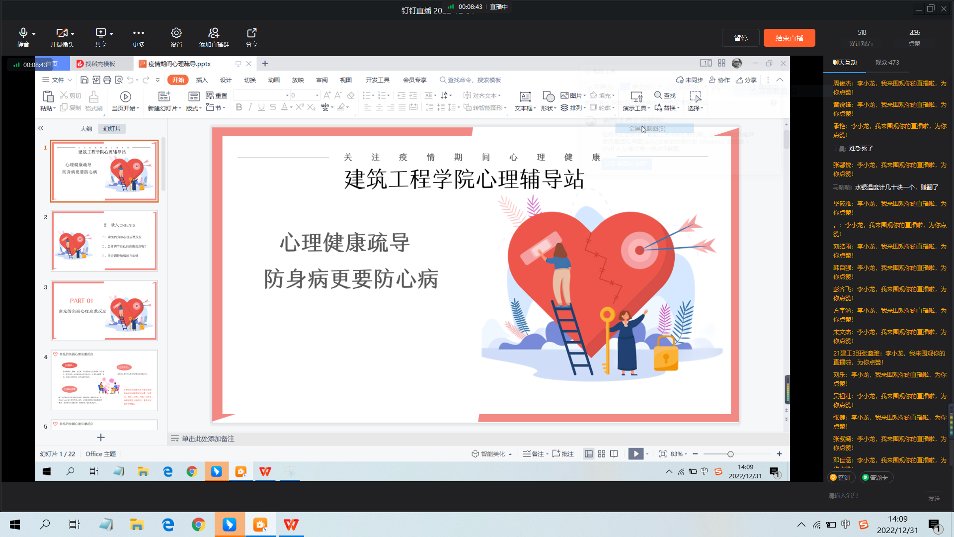 在新冠疫情防控的新形势下,为缓解学生面对奥密克戎来袭的心理压力,调适紧张和焦虑情绪,提高学生对因疫情而出现心理问题的应对技巧,12月31日下午,开云kaiyun体育组织开展了线上心理疏导讲座,由开云kaiyun体育心理老师李小龙担任主讲,21级和22级全体学生观看了此次讲座。